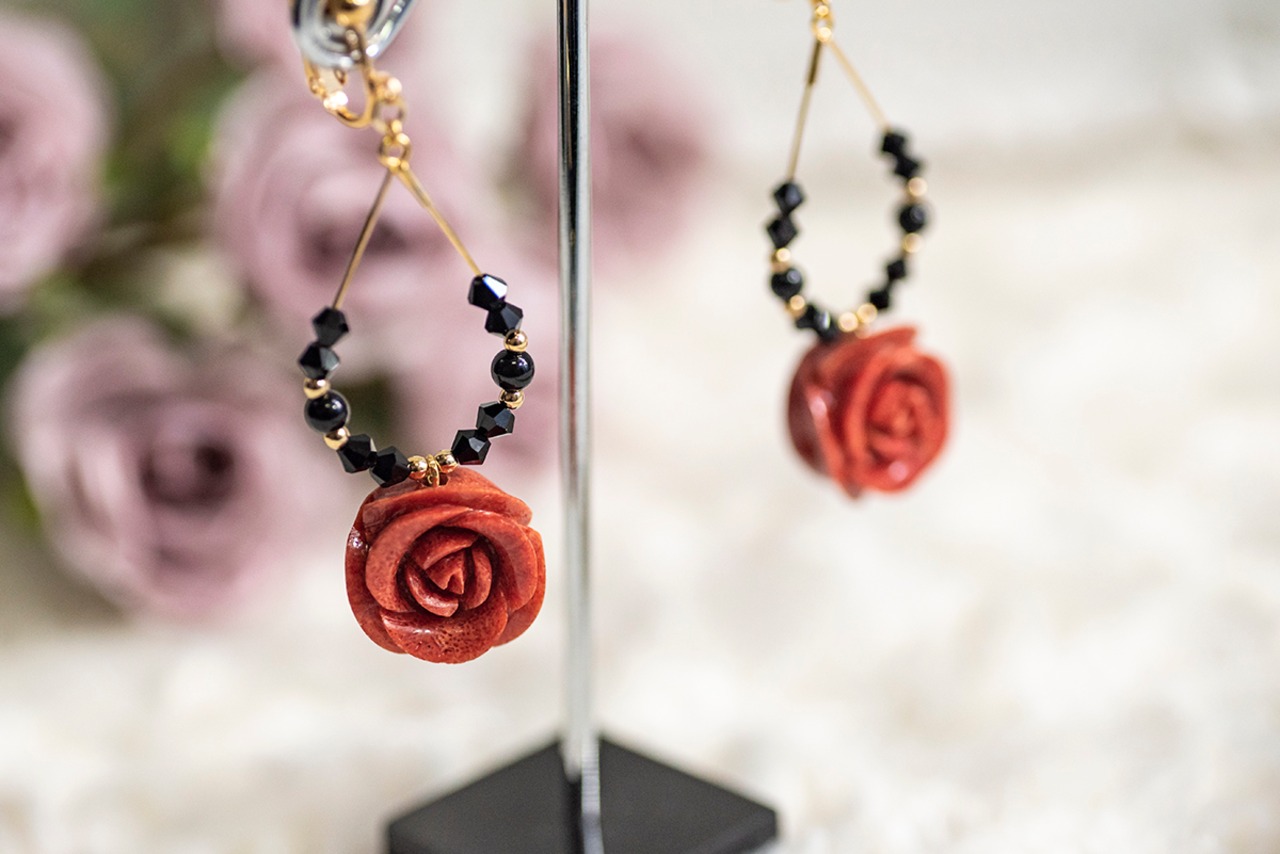 赤の薔薇としずく型のゴールド、オニキスの組み合わせは大人の女性にぴったりです!